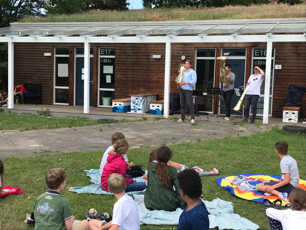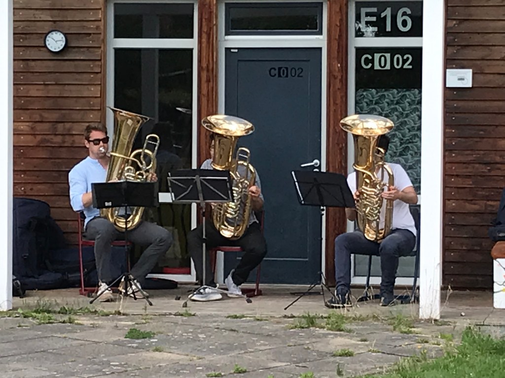 Nebelhorn, Didgeridoo oder Walgesänge? Diese Frage konnte man sich am vergangenen Donnerstag stellen, wenn man das Gelände der IGS Querum betrat. Auf der Terrasse des Freizeithauses der Schule, welches in absehbarer Zeit wohl leider dem Neubauprojekt der Grundschule weichen muss, trat das Trio „Tubakunst“ auf. Die drei jungen Tubisten, alle Studierende der Musikhochschule Hannover und vermittelt durch den Verein „Kinderklassik.com“, stellten in einem kleinen Konzert vor dem 5. Jahrgang der Schule ihr Instrument vor und beantworteten auch geduldig die Fragen der Schülerinnen und Schüler. Wer weiß schon, dass eine Tuba rund 10 Kilogramm wiegt oder dass das Rohr des Instruments beeindruckende 4 Meter lang ist? Es wurde aber natürlich nicht nur gefragt und geredet: Im Mittelpunkt stand selbstverständlich die Musik. Wer hätte gedacht, dass „Maria“ aus der „West-Side-Story“ auch von drei Tuben gespielt so schön klingt? Die Schülerinnen und Schüler waren besonders von einem Solostück begeistert. Hier wurde die Tuba nicht nur gespielt, sondern es wurde in das Instrument gesungen und auch Beatboxen kann man mit einer Tuba. Die Schülerinnen und Schüler der IGS Querum waren jedenfalls nachhaltig begeistert und hätten sich gewünscht, dass es noch mehr tolle Tubamusik gegeben hätte.