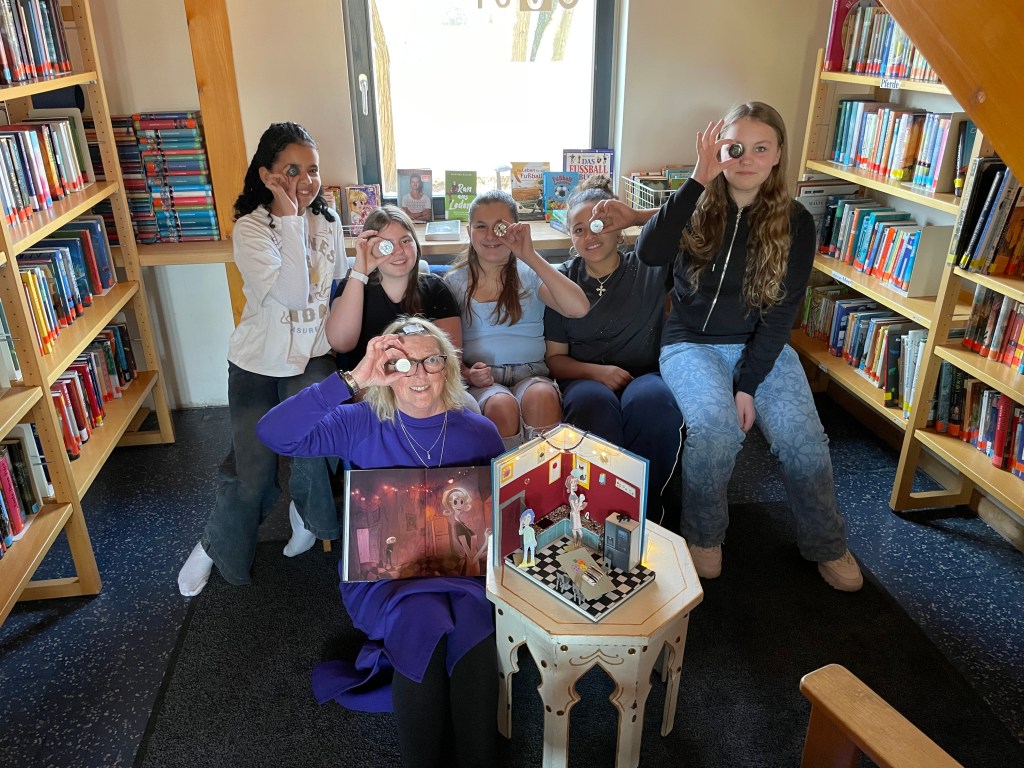 Wir haben uns für die Szene in der Küche entschieden, weil Coraline’s Abenteuer dort ihren Lauf nahm. Das Miniatur-Buchzimmer ist in unserer Pausenhalle in der Vitrine des LeseClubs ausgestellt.