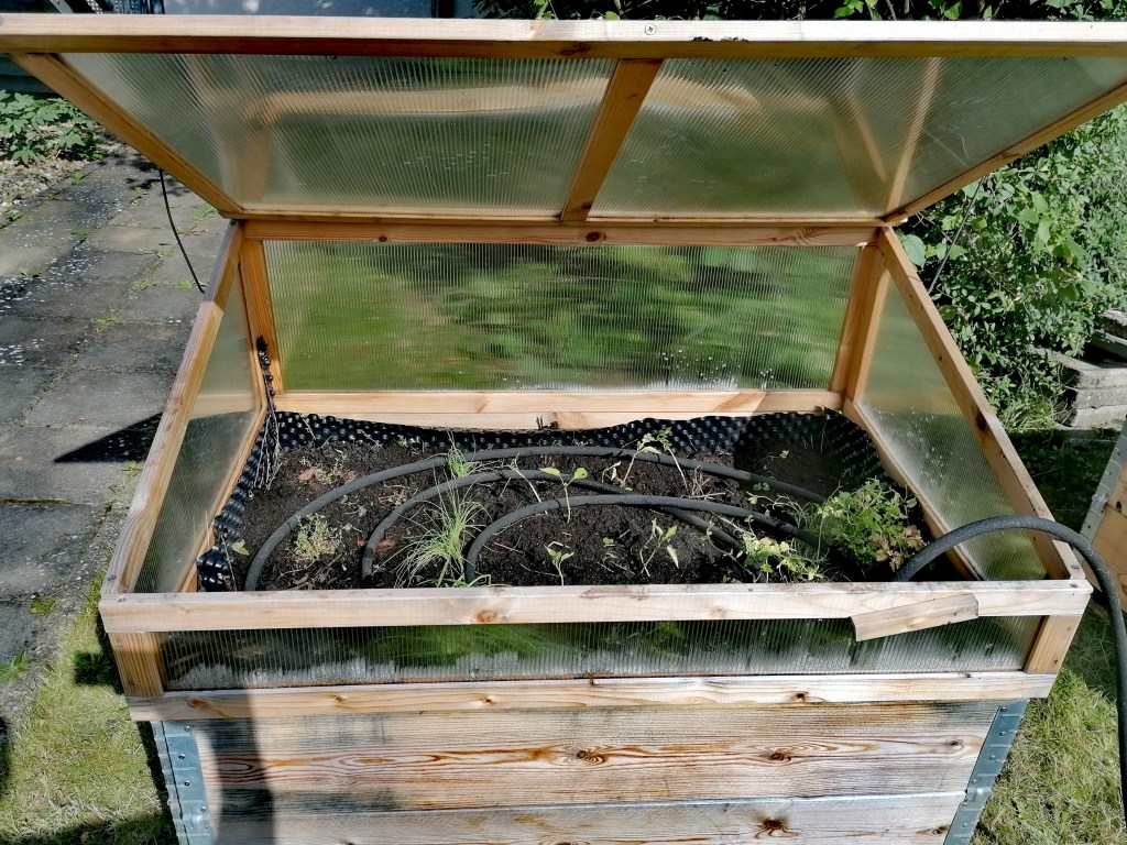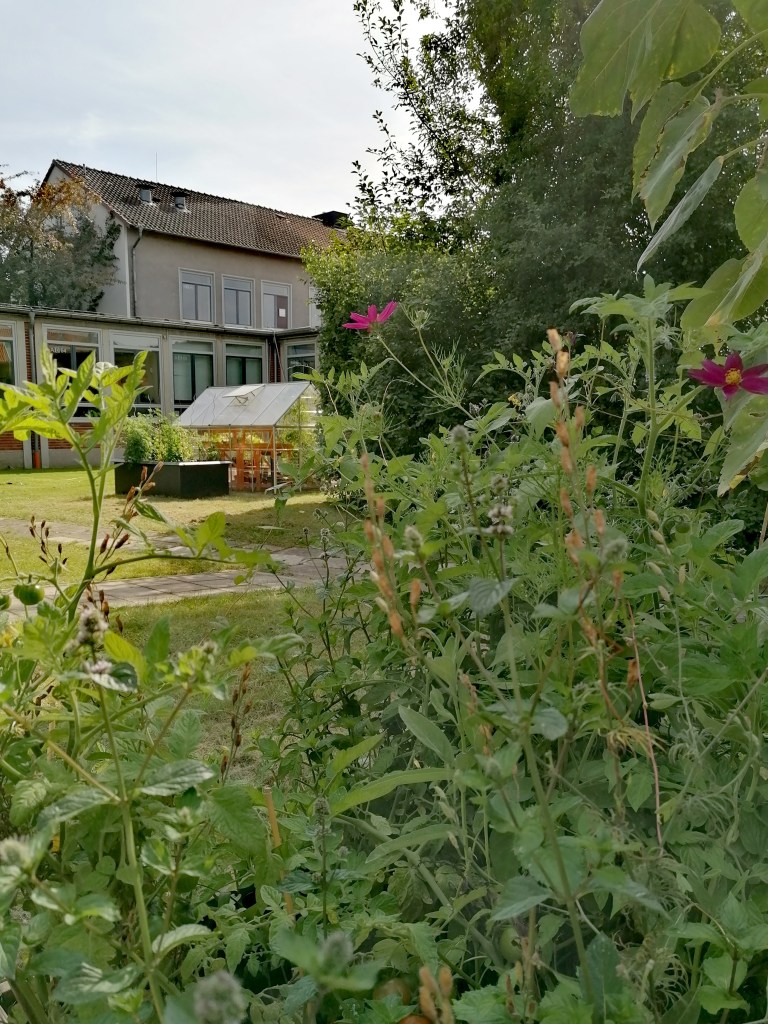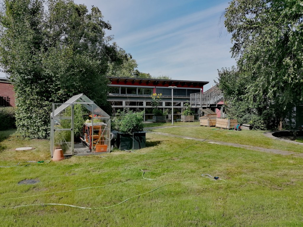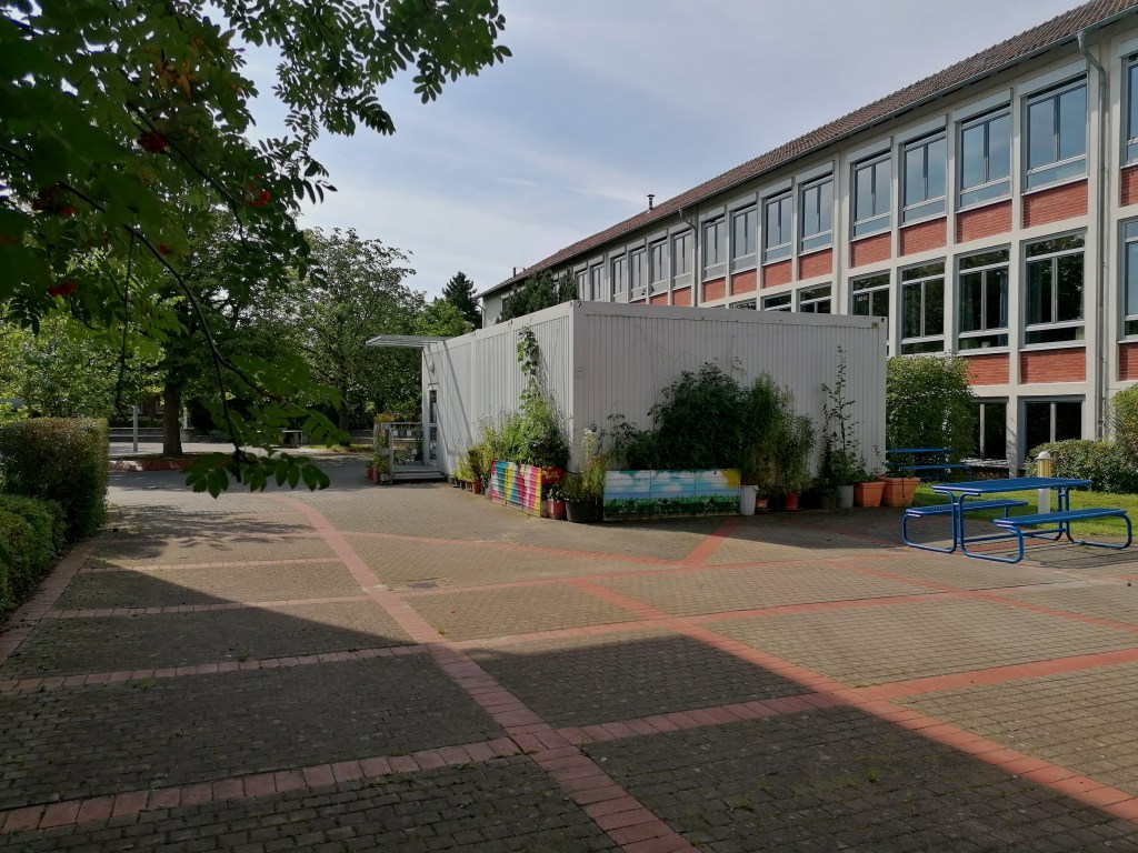 2024 haben wir im Innenhof ein Gewächshaus, ein Gerätehaus sowie etliche Hoch- / Frühbeete errichtet. So können wir dort von der Ansaat bis zur Ernte alles selbst machen. Für unsere Anzucht im Gewächshaus wählen wir robuste, wenig anfällige Sorten, die ohne Chemie auskommen. Wir kompostieren und nutzen eigene Pflanzerde; wir verwenden Pflanztöpfe immer wieder, retten Pflanzen über Foodsharing oder tauschen diese in Kollegium und Elternschaft. Die Hochbeete sind mobil, da sie eventuell im Zuge des Schulumbaus nochmal den Platz wechseln sollen.