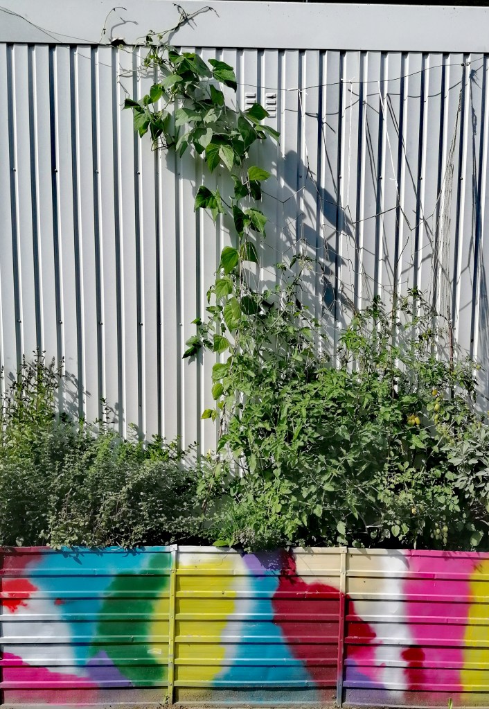 Die 2023 begonnene Vertikalbegrünung eines auf dem Schulhof befindlichen Schulcontainers wird stetig erweitert und dient als für alle an der Schule gut zugänglicher Nasch- & Küchengarten, hier stehen große Kübel mit Beeren- & Säulenobst sowie zwei Hochbeete für selbst gezogene Küchenkräuter bzw. eigene Obst- / Gemüsepflanzen.