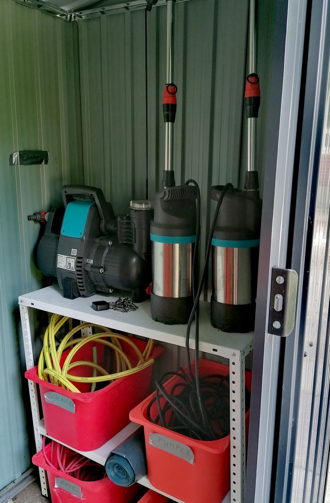 Zum Wässern unserer drei Gärten wurde jetzt eine moderne, sparsame Bewässerung installiert. Sie besteht jeweils aus einem oder mehreren Bewässerungscomputern samt Feuchtigkeitssensoren, Sprüh- / Perlschläuchen bzw. einem Micro-Drop-System im Gewächshaus. So können wir wassersparend früh morgens oder spät abends wässern. Uns ist wichtig, dass unsere Gärten auch an Wochenenden und in Ferienzeiten gewässert werden. Auch sammeln wir Regenwasser in Regentonnen und entnehmen dieses ebenfalls größtenteils automatisch mit Tauchpumpen. Unsere Projekte sind nachhaltig und ressourcenschonend.